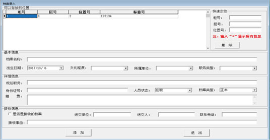 檔案入庫,是對檔案進行錄入,檔案名稱為必填信息?梢源娣诺奈恢茫菏秋@示目前檔案柜中空余的位置信息。如果是接收的檔案,請選擇“是否是接收的檔案”選擇框,并填寫信息,其中送交單位和送交人為必填信息。