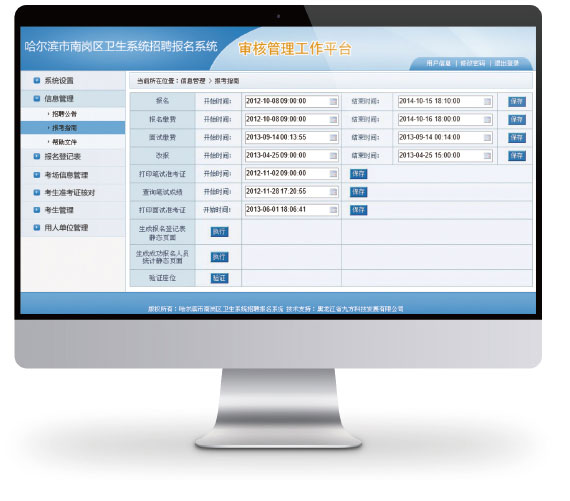 系統設置:注冊時間段、報名時間段、改報時間段、繳費時間段等的設置,控制考生的操作流程。